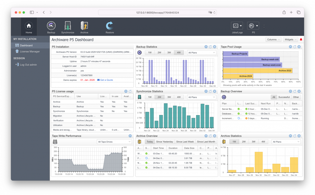 Die Archivierungssoftware Archiware P5 ist eine Lösung zur Langzeitarchivierung und Medienbewahrung. Archiware P5 bietet eine browserbasierte Oberfläche für eine schnelle und einfache Konfiguration, Verwaltung und Überwachung - unabhängig von Ihrem Standort. Die P5 Archive Software bietet Multiplattform-Unterstützung von macOS, Windows, Linux, QNAP, Synology, FreeNAS/TrueNAS und NetGear für maximale Flexibilität bei aktuellen Setups und möglichen zukünftigen Plattformwechseln.